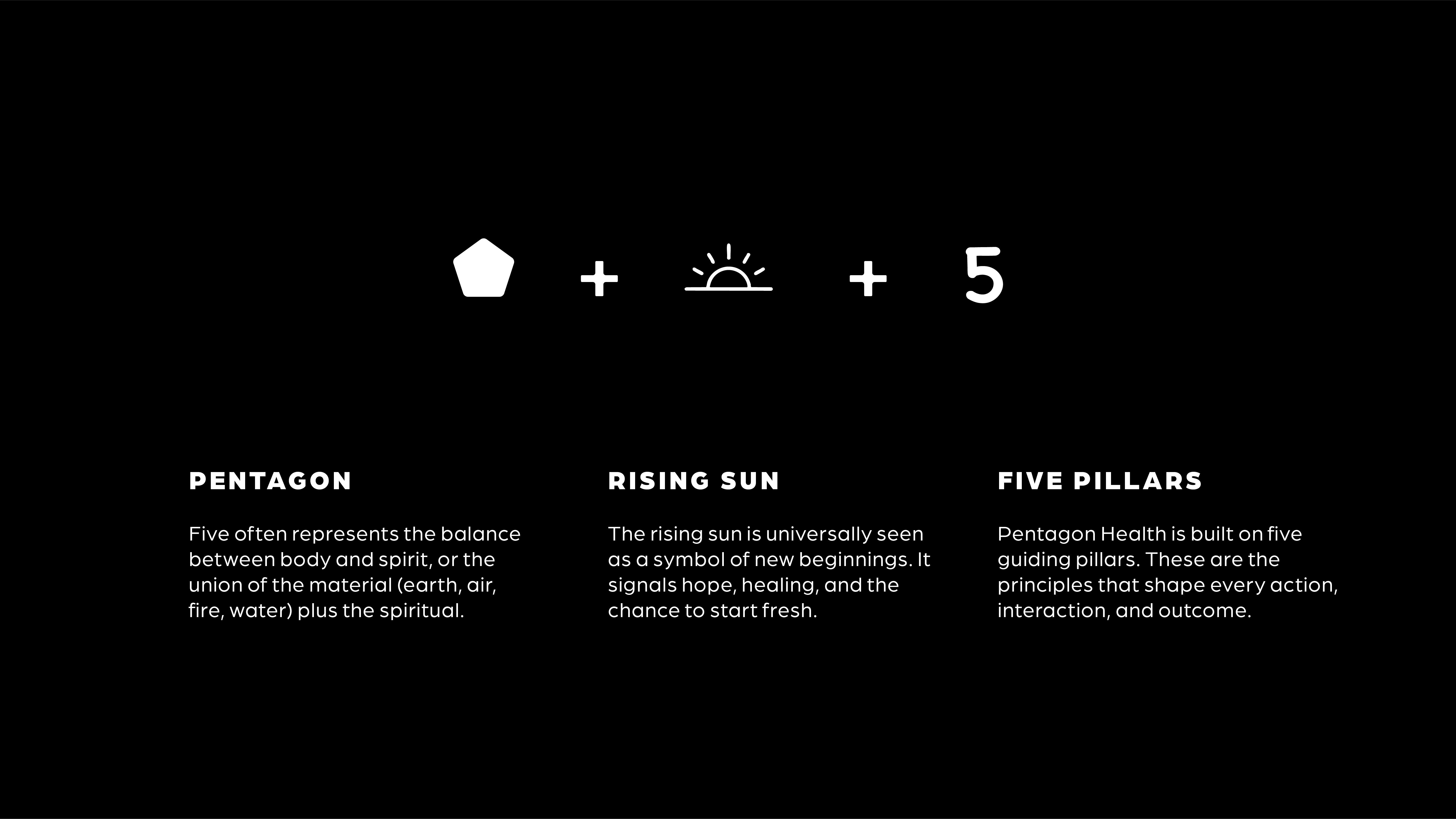 The mark brings together three ideas: A pentagon representing the balance between body and spirit, and the complete health journey Pentagon Health supports. A rising sun, a universal symbol of new beginnings, hope, and the chance to start fresh. And the number five, woven throughout as a quiet but constant reminder of the principles that shape every action, every interaction, every outcome. Together they form a mark that feels grounded, purposeful, and full of meaning without ever feeling overcrowded.